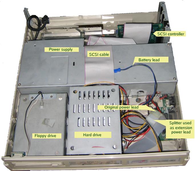 - Screw the cage down. Make sure the SCSI cable from the drive lies flat on top of the power supply, and then put the top of the case back on (remembering to reconnect the lead to the batteries).