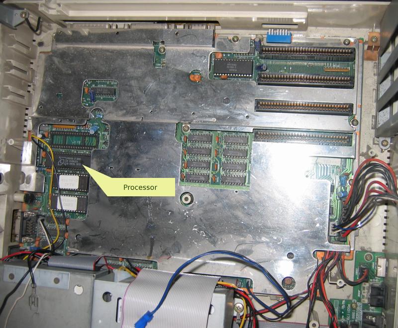 - Open up the case; there are two screws at the front, two at the back, and three where the expansion cards plug in. The top half of the case is connected to the bottom half by a blue and black wire which runs to the batteries. Halfway down this wire is a connector; unplug it to allow the halves to be separated completely.