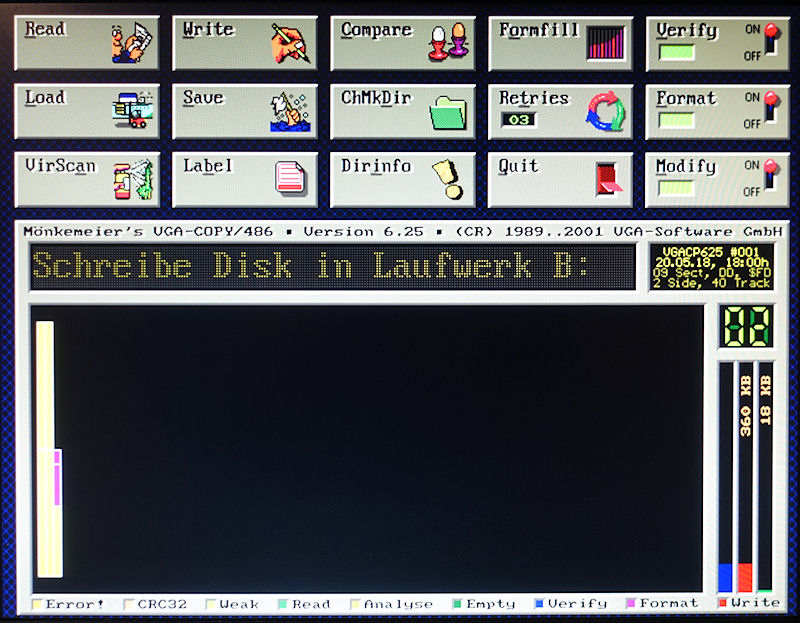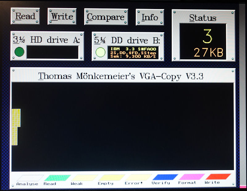I tested VGACOPY 3.3 and also the newest VGACOPY 6.25. Both are NOT able to write to a 360KB floppy disk (in a 360KB floppy drive), producing only yellow errorneous sector blocks on the screen: